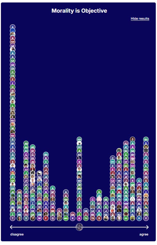 In a survey on the Effective Altruism Forum initiated by Bentham's Bulldog, members were asked to place themselves on a continuum in response to the question “Is Morality Objective? Yes or No.” The result of 312 votes was heavily skewed towards anti-realism, which may surprise some readers: